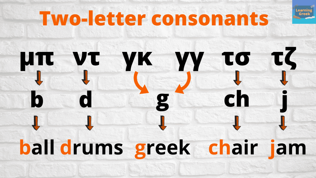- ΓΚ, γκ and ΓΓ, γγ sound like g in the word greek