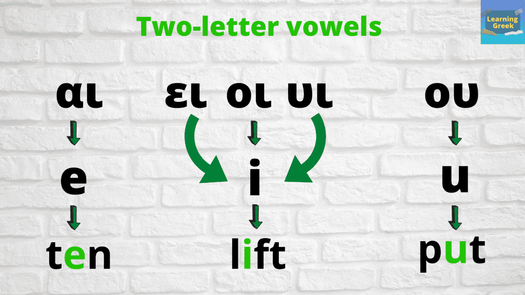 - ΕΙ, ει, ΟΙ, οι and ΥΙ, υι sound like i in the word lift
